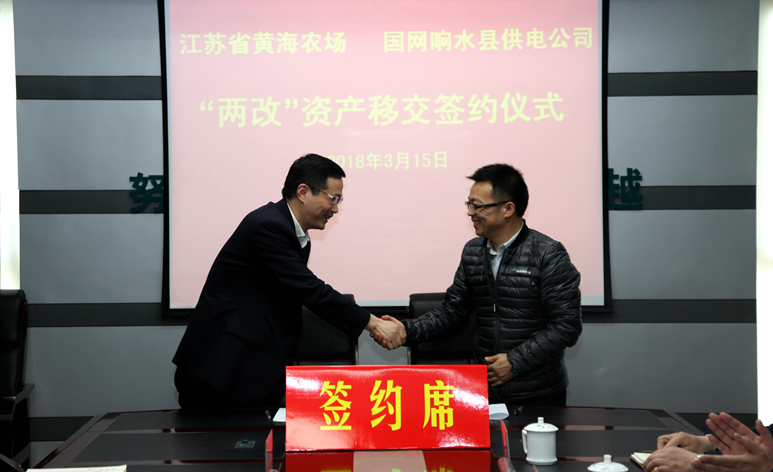 為貫徹落實(shí)國家和省委省政府及集團(tuán)公司黨委關(guān)于加快推進(jìn)農(nóng)場(chǎng)電力改造工作一系列決策部署,加快推進(jìn)黃海電力“兩改”工作。3月15日,黃海農(nóng)場(chǎng)與國網(wǎng)響水縣供電公司電力“兩改”資產(chǎn)移交簽約儀式在響水縣供電公司舉行,標(biāo)志著黃海電力“兩改”工作取得突破性的積極進(jìn)展,進(jìn)入職能接收、維修改造的實(shí)戰(zhàn)階段。黃海農(nóng)場(chǎng)黨委書記王亦勤、場(chǎng)長(zhǎng)單祥忠、副場(chǎng)長(zhǎng)薛亞林,響水供電公司黨委書記楊浩天、副總經(jīng)理沈曉東、王春雨共同出席簽約儀式。農(nóng)場(chǎng)和縣供電公司相關(guān)部室負(fù)責(zé)人參加了簽約儀式。