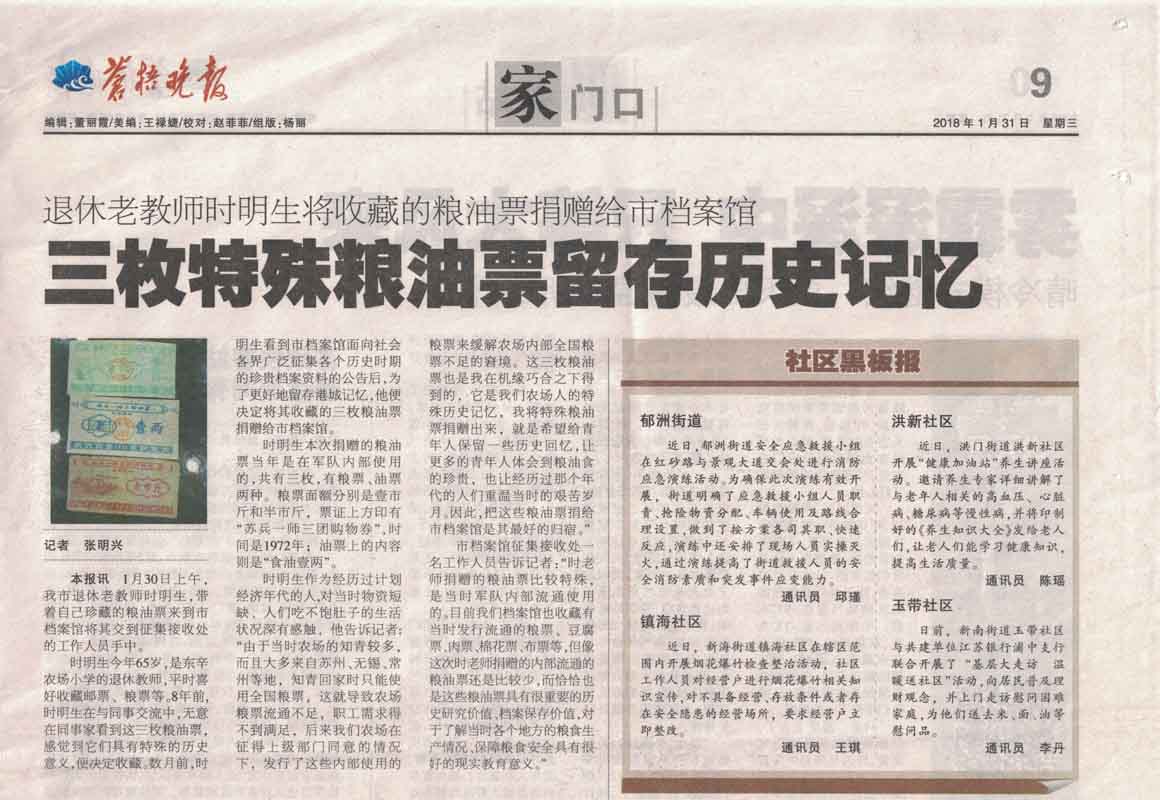 日前,《蒼梧晚報(bào)》在三版頭條位置刊登了《三枚特殊糧油票留存歷史記憶》的新聞報(bào)道,主要講述了東辛農(nóng)場(chǎng)退休老教師將自己珍藏多年文革期間的糧油票捐贈(zèng)給連云港市檔案館的先進(jìn)事跡。