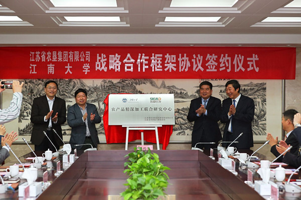魏紅軍對雙方全面戰(zhàn)略合作框架協(xié)議的簽署及農(nóng)產(chǎn)品精深加工聯(lián)合研究中心的掛牌表示祝賀,對蘇墾農(nóng)發(fā)股份公司與江南大學(xué)國家工程實驗室聚焦國際“大健康、大食品、大產(chǎn)業(yè)”前沿技術(shù),合作共建農(nóng)產(chǎn)品精深加工聯(lián)合研究中心給予充分肯定。他指出,江蘇農(nóng)墾與江南大學(xué)有著長期而深厚的合作基礎(chǔ),此次建立全面戰(zhàn)略合作關(guān)系、共建農(nóng)產(chǎn)品精深加工聯(lián)合研究中心,是雙方發(fā)揮各自優(yōu)勢、推進(jìn)“產(chǎn)學(xué)研用”深度合作的重要舉措。期待雙方在合作中,圍繞優(yōu)勢互補(bǔ)、強(qiáng)強(qiáng)聯(lián)合,深入開展協(xié)同創(chuàng)新,共同打造全省農(nóng)產(chǎn)品精深加工、農(nóng)產(chǎn)品質(zhì)量安全、農(nóng)業(yè)物聯(lián)網(wǎng)應(yīng)用的示范基地和校企緊密合作的新典范。希望雙方以此為起點,將戰(zhàn)略合作向更深領(lǐng)域、更高層次推進(jìn),深度整合、共享科技資源和產(chǎn)業(yè)資源,共同為全省乃至全國農(nóng)業(yè)現(xiàn)代化建設(shè)作出更大貢獻(xiàn)。