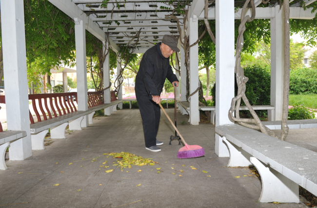 “開始掃地時,我把掃帚和簸箕放在綠化叢中,沒曾想,僅過了一周,掃地的工具不見了蹤影,以后,我只好每天上午或是中午,提前帶著掃帚簸箕和抹布來這里揩擦打掃,在其他老人還沒到來之前,掃清長椅地面,揩去鳥蟲屎后,再垃圾倒入100米開外的垃圾桶中。”楊文才告訴我。