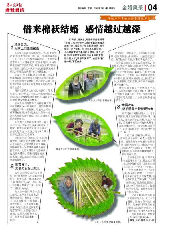在今天出版的東方生活報四版《金婚風采》欄目上,全版刊登了淮海農(nóng)場退休老人陸友生和劉芳結(jié)婚52年來的愛情故事,這也是該欄目今年以來,第7次以整版的文字和圖片形式,刊載淮海老人的愛情故事?,F(xiàn)轉(zhuǎn)摘東方生活報上這篇金婚故事,讓大家一睹為快。