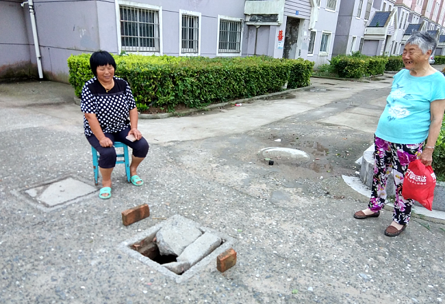 昨天,家住射陽縣淮海農場淮海路19號樓門面房中的農場居民賈長梅,傍晚發(fā)現(xiàn)樓道口間交通要道上的窨井蓋不知何時被過往的車輛壓壞了,知道這是安全隱患的的她,連忙拿來兩塊磚頭放在前后位置,又覺得不妥,就搬來了凳子,一邊坐在旁邊看護,一邊叫人聯(lián)系社區(qū)管理人員前來修復。