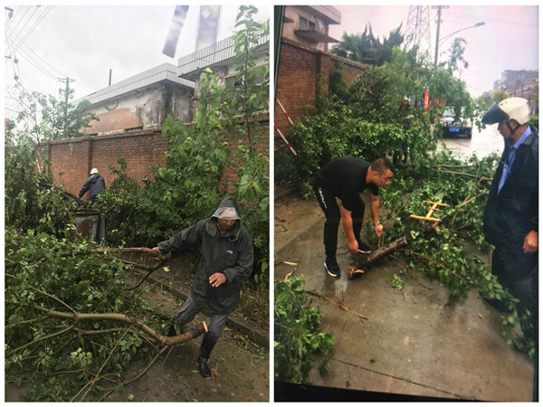 他趕緊向公司匯報了災情情況,并拉設(shè)隔離警示帶,提醒路人繞道行駛,在接到在保證安全的前提下,盡全力救活樹木的指示后,他立即從場部開始巡查,并組織上百名工人先對場部倒伏樹木進行了清理。社區(qū)居委會、環(huán)衛(wèi)所等部門聯(lián)合出動,配合清理打掃、移走折斷樹枝等。直到中午雨停了,工作人員和工人們還在現(xiàn)場清理著,雨衣下的衣服濕了又干了,干了又濕,分不清是雨水還是汗水。