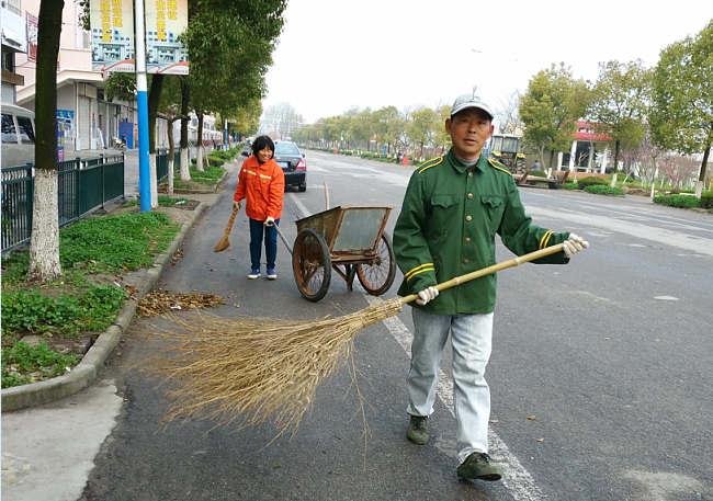 每天當(dāng)我起早走在淮海路上時(shí),總能看到淮海路東西兩邊都有一對(duì)夫婦,穿著桔紅色的工作服在清掃淮海路面時(shí)的鏡頭。雖然保潔工作只是他們其中一個(gè)人的工作,但為了在盡短的時(shí)間內(nèi),完成路面的清掃和保潔工作,他們往往在起早動(dòng)手的同時(shí),還喊來了妻子或是丈夫,一起幫忙,利用人少便于清掃的時(shí)機(jī),婦唱夫隨,拿著掃帚、拎著手叉、推著小車,開始了一天又一天往復(fù)的工作,為農(nóng)場(chǎng)換上了一件整潔的新裝。他們總是起得很早很早,清掃垃圾、處理污穢,盡量減少清掃和運(yùn)輸途中,垃圾產(chǎn)生的氣味對(duì)職工居民的影響。也正是他們不辭辛勞和默默地奉獻(xiàn),讓你為生活在這個(gè)農(nóng)場(chǎng)而自豪,令你擁有這份環(huán)境而愉悅,而這些又讓我為之動(dòng)容。