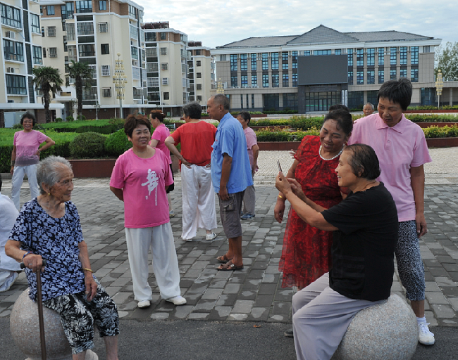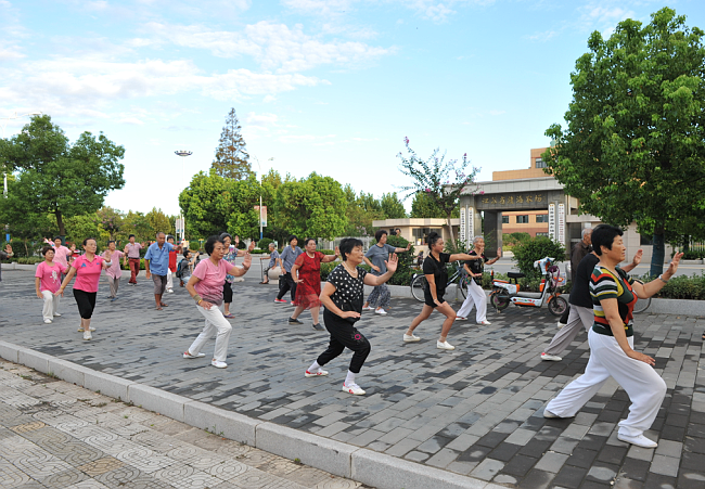 “我母親早晨起來就要叫我?guī)鰜砜纯?,望望大家跳舞,瞧瞧農(nóng)場風(fēng)景,感受下清晨涼爽的空氣。”昨天一早,淮海農(nóng)場群樂小區(qū)的百歲老人張瑞瑞照例又坐著女兒的電瓶車,來到農(nóng)場文化廣場上看風(fēng)景,只見她一走下電瓶車,就徑直坐到打太極拳隊伍旁的球蹲前,靜靜地看著大家,那神情,仿佛就是一名忠實的觀眾,欣賞著太極隊員們表演的節(jié)目。