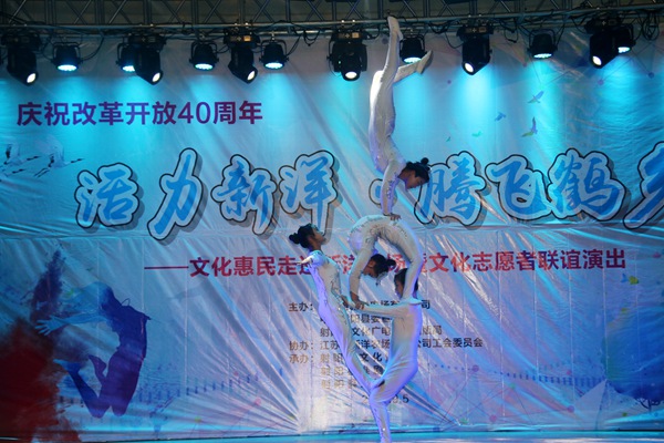 演出在開(kāi)場(chǎng)舞《盛世歡歌》中拉開(kāi)帷幕,女生獨(dú)唱《美麗的丹頂鶴》、舞蹈《吉祥》、雜技《肩上芭蕾》、魔術(shù)《千變?nèi)f化》等節(jié)目形式多樣、層次分明,一曲曲優(yōu)美的歌聲、一段段賞心悅目的舞蹈、一場(chǎng)場(chǎng)精彩絕倫的雜技表演……將現(xiàn)場(chǎng)氛圍漸漸推向高潮,最后,演出在舞蹈《美麗射陽(yáng)》中落下帷幕。
