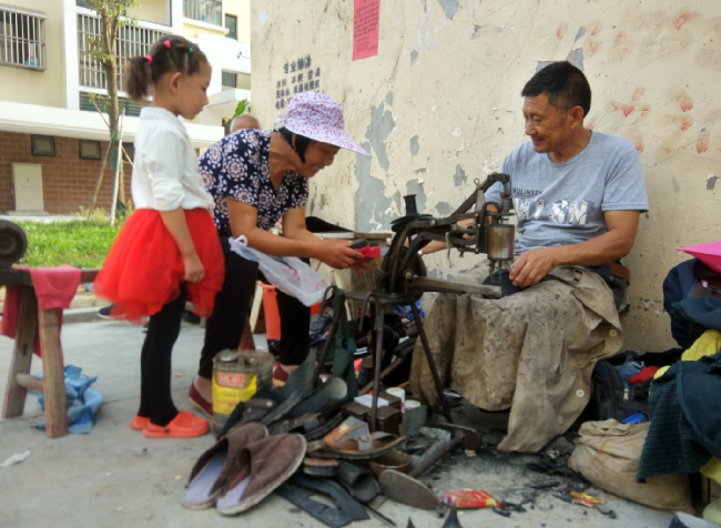 “葛師傅,我家孫女的鞋子破了,能否請你現(xiàn)在就弄,我還有急事。”9月22日下午,筆者看到有一位婦女用自行車拖著一個小女孩來到了葛華的修鞋攤前說。