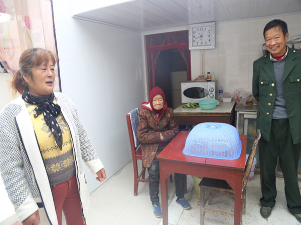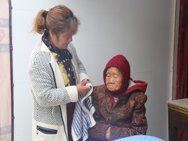 兒子這邊,周萍費(fèi)了苦心,家里的兩位老人,她也盡心盡力照顧。2010年正月,周萍98歲身體一直健康的公公突然中風(fēng)了,可老劉外出打工,兒子在軍校學(xué)習(xí),周萍一時慌了,幸好鄰居經(jīng)過,看到了,給她叫了輛三輪車,到了醫(yī)院,她二話不說,背起老人直往病房樓跑,一百來斤的女子愣是把一百三四十斤的老人背到了三樓的病房,把醫(yī)生都看愣了。但老人畢竟上了年紀(jì),就此癱瘓了。吃穿都不愁,拉撒怎么辦呢?家里又沒有男人,婆婆95歲也需要人照顧,想到公公健康時那么愛干凈,一周都要去浴室洗一次澡,她咬了咬牙,對著已經(jīng)沒有意識的公公說:“爸,湘林不在家,我就是您親閨女,每個人都會老,我照顧您是應(yīng)該的。”過了幾日,浴室管理員看老人好久不來特地跑他們家,看到周萍正給老人換尿不濕,問人知道是兒媳后直豎大拇指。