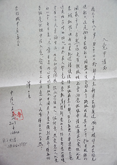 近日,八十一歲的李正山老人再次向新洋城中黨支部遞交了入黨申請(qǐng)書(shū),一封、兩封、三封……一寫(xiě)就是好幾年,這位耄耋老人的入黨情懷成為廣為傳頌的佳話。
