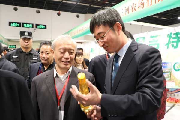 交易會(huì)開(kāi)幕當(dāng)日,江蘇省農(nóng)業(yè)農(nóng)村工作領(lǐng)導(dǎo)小組副組長(zhǎng)胥愛(ài)貴等領(lǐng)導(dǎo)巡館來(lái)到江蘇農(nóng)墾展館,在集團(tuán)公司企劃部負(fù)責(zé)人和朱明亮的陪同下,專程到臨海農(nóng)場(chǎng)公司展位調(diào)研指導(dǎo)。朱明亮向領(lǐng)導(dǎo)介紹,近年來(lái)農(nóng)場(chǎng)公司按照省委和集團(tuán)公司黨委的統(tǒng)一部署,利用資源和組織化優(yōu)勢(shì),推進(jìn)企業(yè)高質(zhì)量發(fā)展,推動(dòng)產(chǎn)業(yè)提檔升級(jí),塑造生態(tài)健康農(nóng)副產(chǎn)品??梢陨缘慕】涤?ldquo;綠農(nóng)園”牌牡丹籽油就是公司推出的優(yōu)質(zhì)精品之一。胥愛(ài)貴說(shuō),知道臨海農(nóng)場(chǎng)在射陽(yáng)縣境內(nèi),對(duì)臨海農(nóng)場(chǎng)公司種植油用牡丹、發(fā)展牡丹籽油產(chǎn)業(yè)的情況有所了解。他指出,江蘇農(nóng)墾及臨海農(nóng)場(chǎng)公司要在推進(jìn)現(xiàn)代農(nóng)業(yè)建設(shè)和推進(jìn)質(zhì)量可追溯的健康農(nóng)副產(chǎn)品方面發(fā)揮示范引領(lǐng)作用;要通過(guò)交易會(huì)這個(gè)平臺(tái),推出更多、更好的優(yōu)質(zhì)農(nóng)副產(chǎn)品給上海大眾,展示江蘇現(xiàn)代農(nóng)業(yè)發(fā)展的成就,讓上海各界人士更好地了解江蘇及品味江蘇優(yōu)質(zhì)農(nóng)產(chǎn)品。一同參加巡館的江蘇省糧食局夏春勝局長(zhǎng)詳細(xì)詢問(wèn)了“綠農(nóng)園”牌牡丹籽油的種植、生產(chǎn)、品牌開(kāi)發(fā)及經(jīng)營(yíng)銷售等情況。