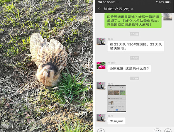 12月13日下午3點(diǎn),新洋農(nóng)發(fā)分公司新南生產(chǎn)區(qū)技術(shù)員陳兆妍在二十三大隊(duì)N30號田檢查時(shí),突然發(fā)現(xiàn)一只大鳥無法飛行,發(fā)出陣陣哀嚎。