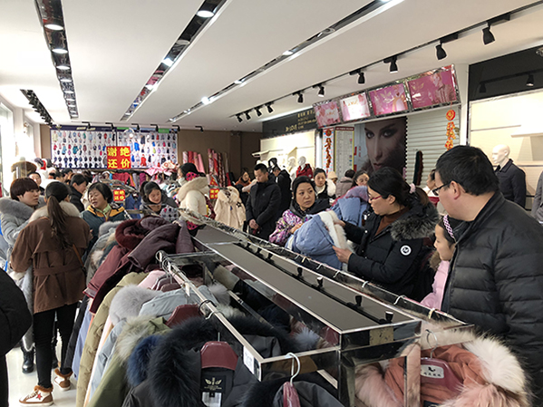 現(xiàn)場(chǎng),顧客們進(jìn)出于沿街服裝店面,挑選自己喜愛(ài)的羽絨服。營(yíng)業(yè)員掛著笑容不厭其煩地向顧客介紹新款新品羽絨服,顧客朋友們穿走的是溫暖,帶走的是放心。