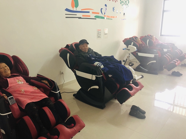 四張舒適的躺椅對(duì)面擺放著一臺(tái)彩色電視機(jī),墻上有空調(diào),室內(nèi)有足部按摩器,艾灸理療儀,陽(yáng)光充足,這就是新洋農(nóng)場(chǎng)居家養(yǎng)老服務(wù)站的日間照料室。其余多間活動(dòng)室內(nèi),老人們?nèi)宄扇?,有的搓麻將,有的下棋,有的在按摩椅上享受。二樓精神慰籍室一群老人正坐著閑聊,沐浴在陽(yáng)光下,臉上洋溢著滿足的笑容。