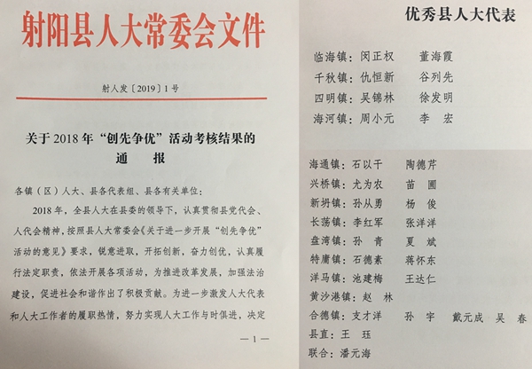 據(jù)射陽縣人大常委會文件射人發(fā)[2019]1號《關(guān)于2018年“創(chuàng)先爭優(yōu)”活動考核結(jié)果的通報》獲悉,新洋農(nóng)場有限公司董事長、總經(jīng)理潘元海獲“優(yōu)秀縣人大代表”榮譽稱號。