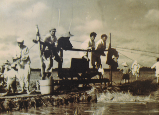 七月二十三日晚上,十二團(tuán)六連勇士們又出發(fā)了,到一分場場南二十四號至三十六號條田去排除積水。今晚不是戽水,而是用水車車水。大多數(shù)戰(zhàn)士是啟海一帶人,對踏車很生疏。面對著這樣情況,徐文和連長就根據(jù)現(xiàn)有的十三架水車、八十個人,進(jìn)行科學(xué)分工,他決定會踏車與不會踏車的人搭配開來,一架水車六個人,互教互學(xué)。