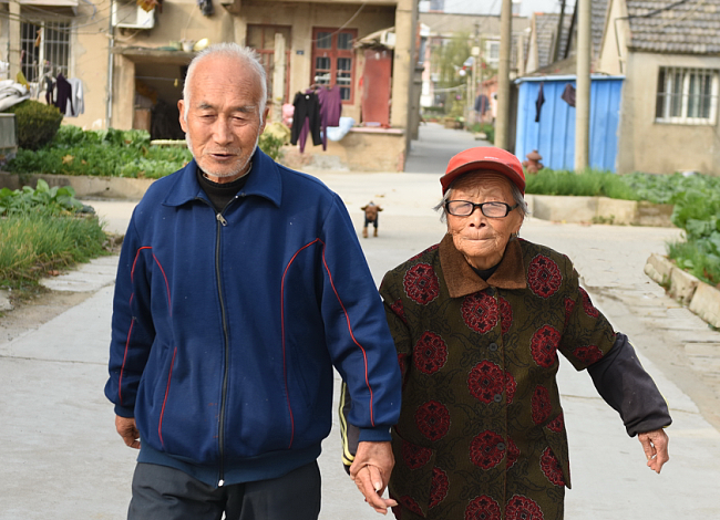 在淮海農(nóng)場社區(qū)振興小區(qū),我們常??梢栽谵r(nóng)場社區(qū)的廣場、菜市場、馬路上看到有這么一對頭發(fā)花白的夫婦,丈夫總是在前邊走,妻子躬著腰在身后三五米遠跟著。如果你認為是丈夫不等妻子一起走那可是大錯特錯了,其實這是源于妻子視力差,所以跑步時,丈夫總是在前面用自己的身影給老伴帶路,這種一前一后如影相隨的鏡頭并形成特色,并定格在淮海人的心間,并稱贊他們是相濡以沫的模范夫妻。這對夫婦就是農(nóng)場社區(qū)86歲的錢德明和83歲的姚靜珍夫婦,他們已經(jīng)一起攜手走過了60多年。