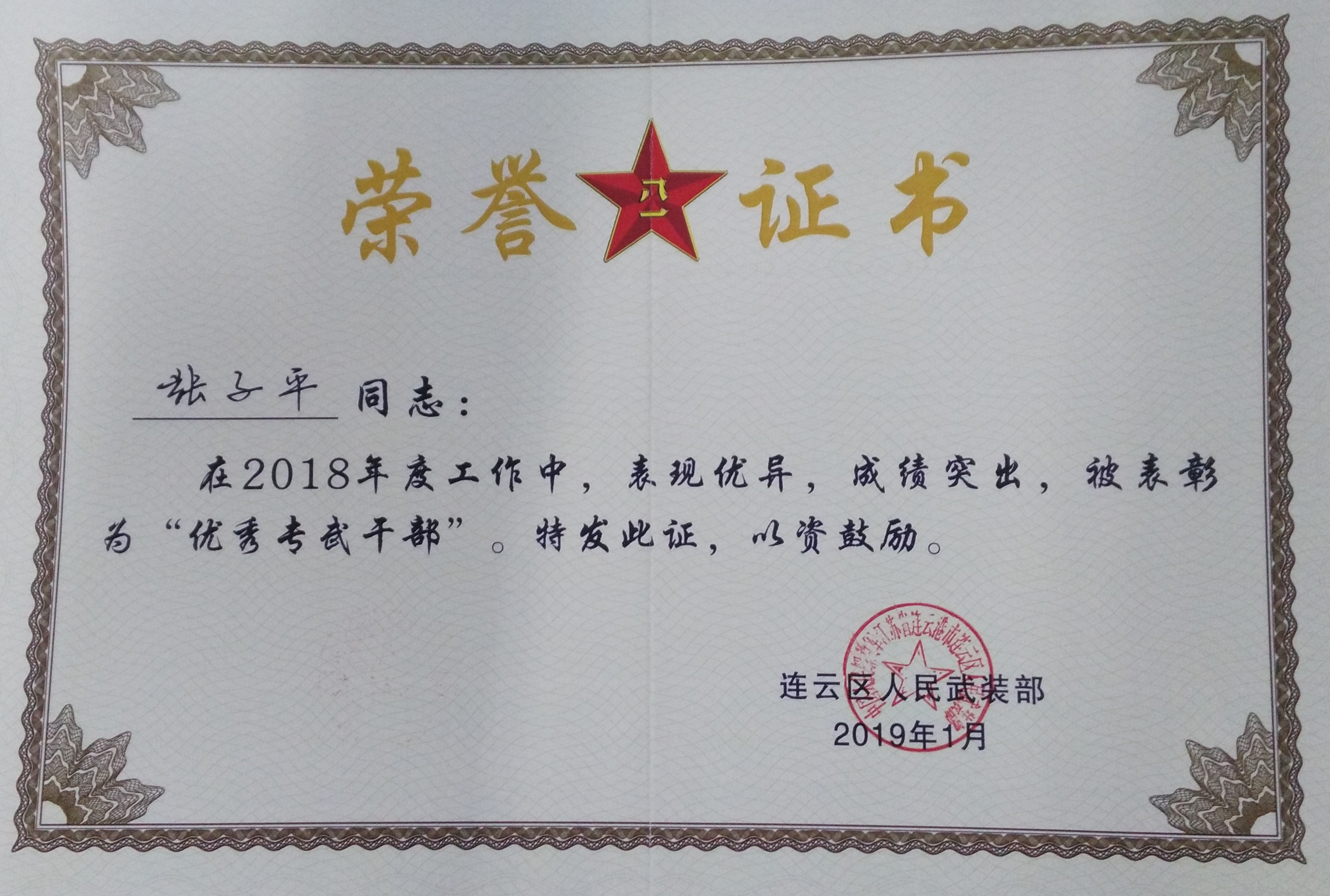 (圖為東辛農(nóng)場人武部部長張子平獲評連云區(qū)優(yōu)秀專武干部證書)