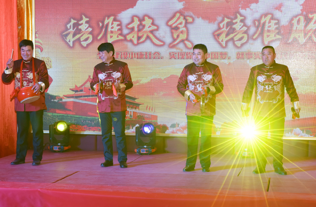 下場(chǎng):咚咚咚咚嗆、咚咚咚咚嗆、咚咚咚咚嗆嗆、咚咚咚咚嗆(圖為團(tuán)拜會(huì)上精準(zhǔn)扶貧政策好三句半劇照。)
