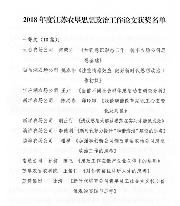 近日,從蘇墾部政研【2019】1號(hào)文獲悉,新洋八篇思想政治論文獲得集團(tuán)公司2018年優(yōu)秀論文表彰。其中,一等獎(jiǎng)2篇,二等獎(jiǎng)2篇,三等獎(jiǎng)4篇。