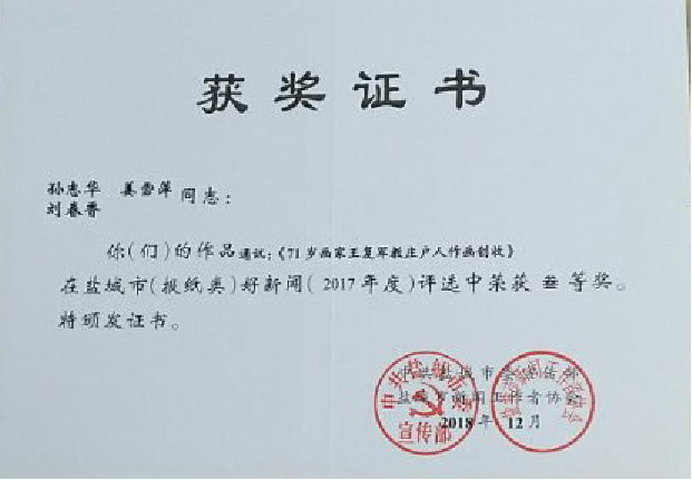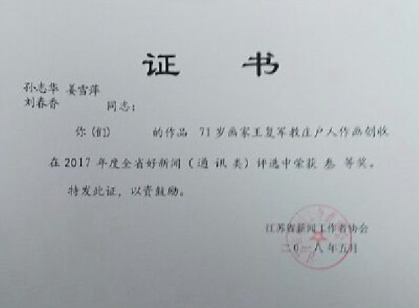 4月9日下午,淮海農(nóng)場有限公司通訊員姜雪萍、劉春香等陸續(xù)收到了郵遞員送來的獲獎(jiǎng)信件,由孫志華、姜雪萍、劉春香合寫的《71歲畫家王復(fù)軍教莊戶人作畫創(chuàng)收》通訊稿,2018年5月,被江蘇省新聞工作者協(xié)會(huì)評(píng)為2017年江蘇省好新聞叁等獎(jiǎng);同時(shí)這篇通訊稿在2018年12月,被中共鹽城市委宣傳部、鹽城市新聞工作者協(xié)會(huì)在報(bào)紙類(2017年度)好新聞評(píng)選中也榮獲了叁等獎(jiǎng)。圖為獲獎(jiǎng)證書。