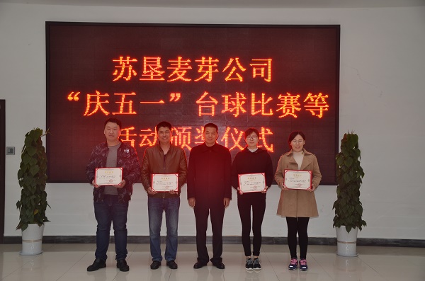 4月29日下午,蘇墾麥芽公司舉辦“慶五一”臺(tái)球比賽等活動(dòng),公司各部門共計(jì)70余名員工參加了比賽,公司經(jīng)營層領(lǐng)導(dǎo)參加了此次活動(dòng)并為獲獎(jiǎng)選手頒發(fā)證書。
