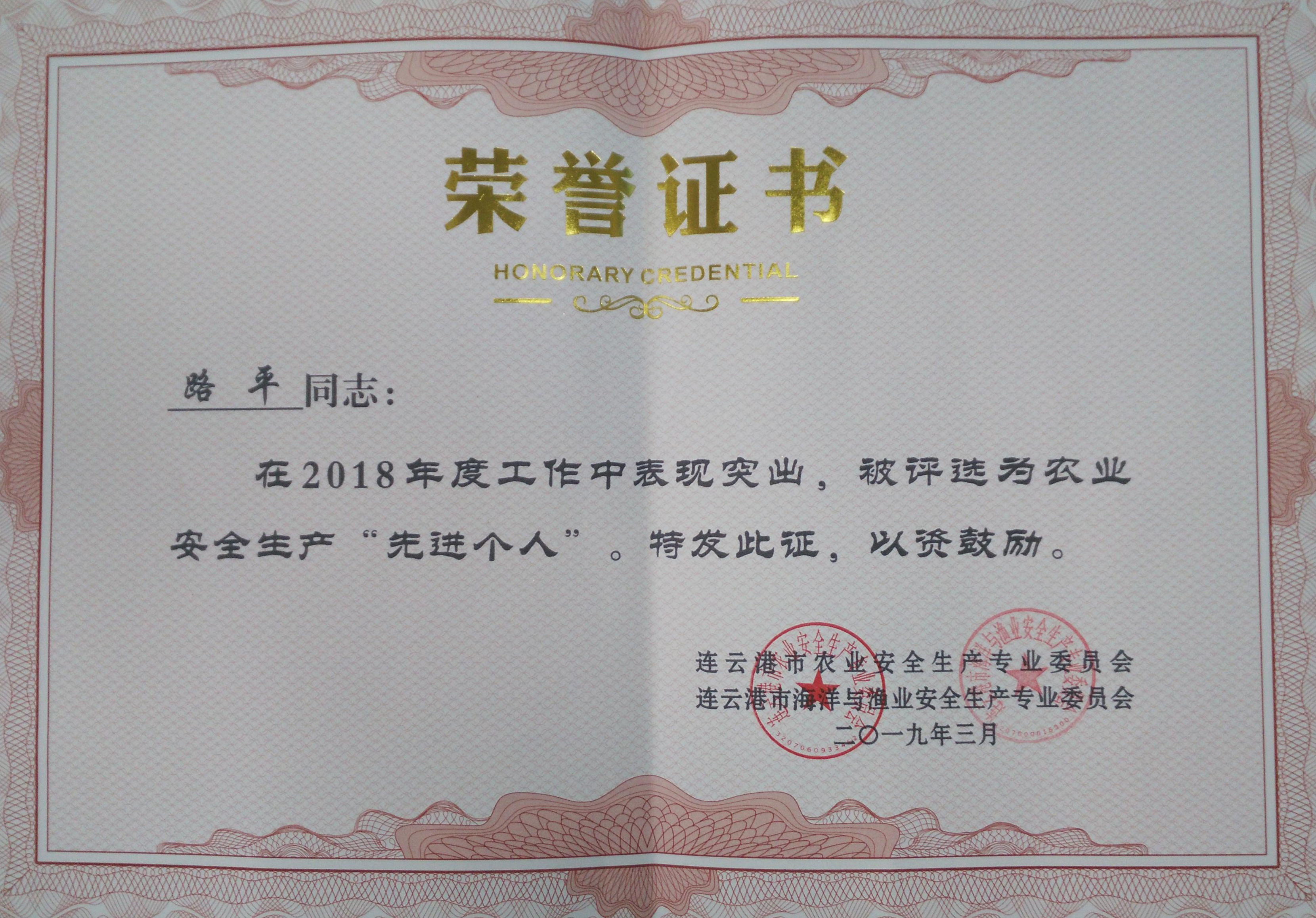 (東辛路平獲得市農(nóng)業(yè)安全生產(chǎn)“先進(jìn)個(gè)人”榮譽(yù)證書)