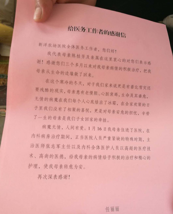 患者家屬在信中深情寫道,“病魔無情,人間有愛。1月16日我母親住進(jìn)了醫(yī)院,在內(nèi)科病房治療期間,在醫(yī)院人員嚴(yán)重緊缺的特殊時期,主治醫(yī)師張志軍主任以及內(nèi)科全體醫(yī)護(hù)人員以高超的醫(yī)療技術(shù)、高尚的醫(yī)德,給我母親的病情給予積極的治療和精心的護(hù)理,使我母親轉(zhuǎn)危為安。再次深表感謝!”