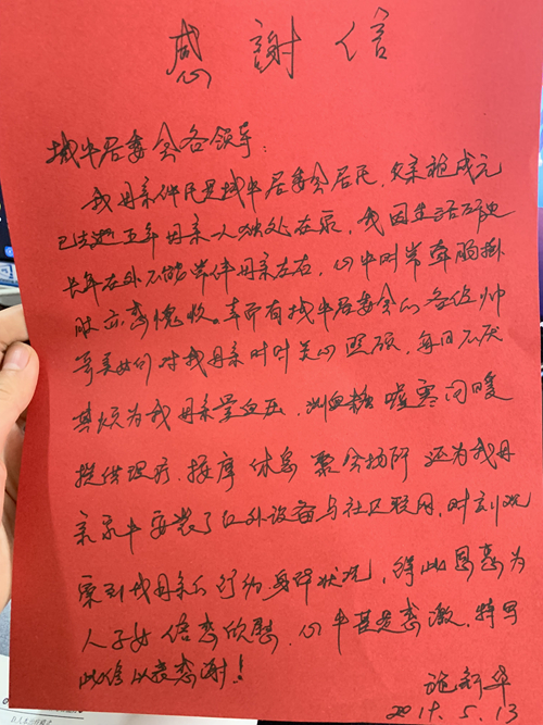 5月13日,家住10村的仲明老人的女兒將一封感謝信送到了新洋居家養(yǎng)老服務(wù)中心,表達(dá)對(duì)社區(qū)和居養(yǎng)老服務(wù)中心關(guān)心和幫助她母親的感謝之情。