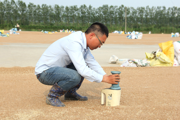 在?港分公司第三生產(chǎn)區(qū)12連場頭,個子不高的徐暉正忙著檢測麥子的水分,囑咐工人將小麥該進倉的進倉,能打囤的打囤,及時騰場,各個品種絕不能搞混了。小麥色的膚色、略帶沙啞的聲音,安排工作時簡要、利落,小徐渾身上下透露著忙而不亂的從容。自2015年從揚大研究生畢業(yè)后,徐暉就應(yīng)聘到蘇墾農(nóng)發(fā)?港分公司擔任技術(shù)員,幾年來,在農(nóng)場這片土地上工作、學習、生活,他被“艱苦奮斗、勇于奉獻、開拓創(chuàng)新”的農(nóng)墾精神感染著、浸潤著,為自己貼上了“農(nóng)墾人”的標簽。