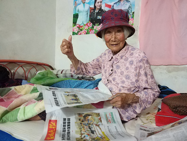 朱榮美在5年前就在農(nóng)場(chǎng)渠星路上購(gòu)置了一套2居室的樓房,只是為了照顧母親,他們一直沒有上樓居住。雖然現(xiàn)在他們居住的房屋較破舊,但門前種植的是稻麥林地,空氣環(huán)境卻是很好。逢年過(guò)節(jié)也是家中最熱鬧的地方,家中的兒女孫輩都要來(lái)到這里看望慰問(wèn)老人,這時(shí)也是老人最開心的時(shí)刻。圖為邱維珍老人在文章中刊登的照片和老人拿起報(bào)紙欣喜的鏡頭。
