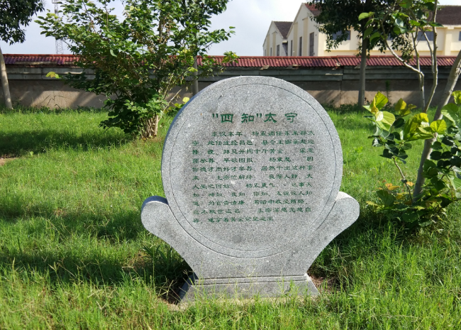 在淮海農(nóng)場(chǎng)淮海廉政公園內(nèi)北側(cè)的小路旁,有四塊鏡面圓形的碑石,其中一面碑石上刻著東漢太尉楊震“四知”太守的廉政故事,上面雕刻著“天知、地知、你知、我知”“四知”拒金故事一直被人稱頌,為人們所津津樂道。其碑文上面雖然只有短短的140個(gè)字,但反映出來的廉政故事和所衍生出來的廉政家風(fēng),卻為世人代代相傳,堪稱為政清廉的典范。淮海廉政主題公園在打造的過程中,特地把楊震“四知卻金”的故事選入進(jìn)來,就是配合農(nóng)場(chǎng)公司在進(jìn)行軍墾傳統(tǒng)文化教育的同時(shí),也讓人們享受到古時(shí)候的為官者清廉執(zhí)政的形象,更加激發(fā)起為民用權(quán)、謹(jǐn)慎用權(quán)的行為規(guī)范。