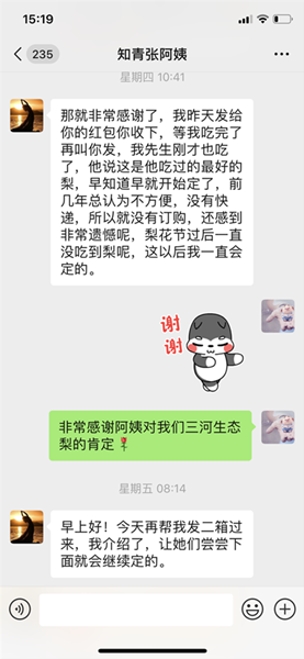 “三河梨太好吃了,是我吃過(guò)最好吃的梨”三河知青張蓮英在品嘗了三河農(nóng)場(chǎng)優(yōu)質(zhì)梨連連稱(chēng)贊。“前幾年交通不便,郵購(gòu)速度慢容易導(dǎo)致梨不新鮮,就沒(méi)有認(rèn)購(gòu)梨樹(shù),感到非常遺憾,一直沒(méi)有品嘗到三河的梨,以后年年都要預(yù)定、、、、”自三河優(yōu)質(zhì)梨上市以來(lái),訂單不斷、好評(píng)不斷,三河老知青得知農(nóng)場(chǎng)梨成熟了,紛紛下單訂購(gòu)梨子,并且在知青群里、朋友圈轉(zhuǎn)發(fā)三河梨園采摘季活動(dòng),宣傳三河優(yōu)質(zhì)梨。