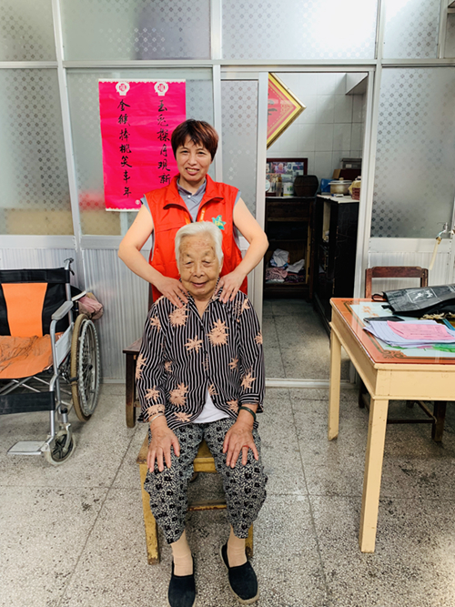 28日上午,在新洋10村15棟4號(hào)的盛雪芳老人家,我們見到了風(fēng)雨無阻為老人服務(wù)的護(hù)理員吳蘭英,她胸前掛著工作牌,穿著工作服,正在給87歲的老人按摩。吳蘭英對(duì)準(zhǔn)穴位,揉捏拿切,手法嫻熟,按完后背又按肩膀,一邊工作一邊和老人有說有笑,絲毫不嫌煩。