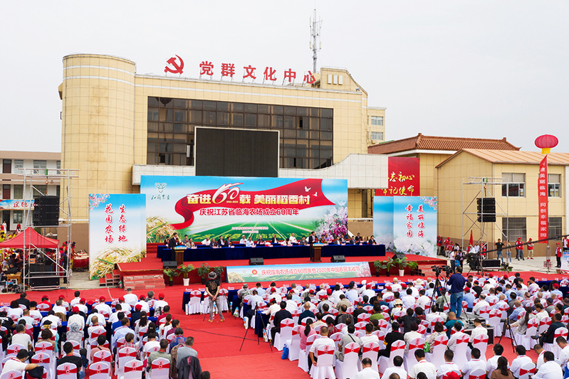 斗轉(zhuǎn)星移,滄海桑田,追憶崢嶸歲月,敘說巨大發(fā)展,展望美好明天。在金秋送爽的豐收季節(jié)里,臨海農(nóng)場公司幸福歡欣地迎來了六十華誕。9月22日,鏗鏘鑼鼓歡迎四方賓朋,裝扮一新的街道張燈結(jié)彩、人頭攢動,洋溢著節(jié)日的喜慶氣氛,江蘇省臨海農(nóng)場公司建場60周年慶?;顒釉邳h群文化中心廣場隆重舉行。江蘇省農(nóng)墾集團(tuán)黨委副書記、總經(jīng)理胡兆輝,中共射陽縣委副書記、射陽縣人民政府縣長吳岡玉,南京林業(yè)大學(xué)副校長張金池、江蘇省沿海開發(fā)集團(tuán)總經(jīng)理周金陽,省內(nèi)外友好單位、集團(tuán)相關(guān)部門領(lǐng)導(dǎo)、地方政府相關(guān)部門負(fù)責(zé)人、原農(nóng)場黨政主要領(lǐng)導(dǎo)、農(nóng)墾兄弟單位領(lǐng)導(dǎo)、校企合作高校領(lǐng)導(dǎo)、農(nóng)場籍知名人士、離退休老同志代表、農(nóng)場知青代表、農(nóng)場公司黨委領(lǐng)導(dǎo)班子成員和職工居民代表700多人歡聚一堂,共同慶祝臨海農(nóng)場公司建場60周年。