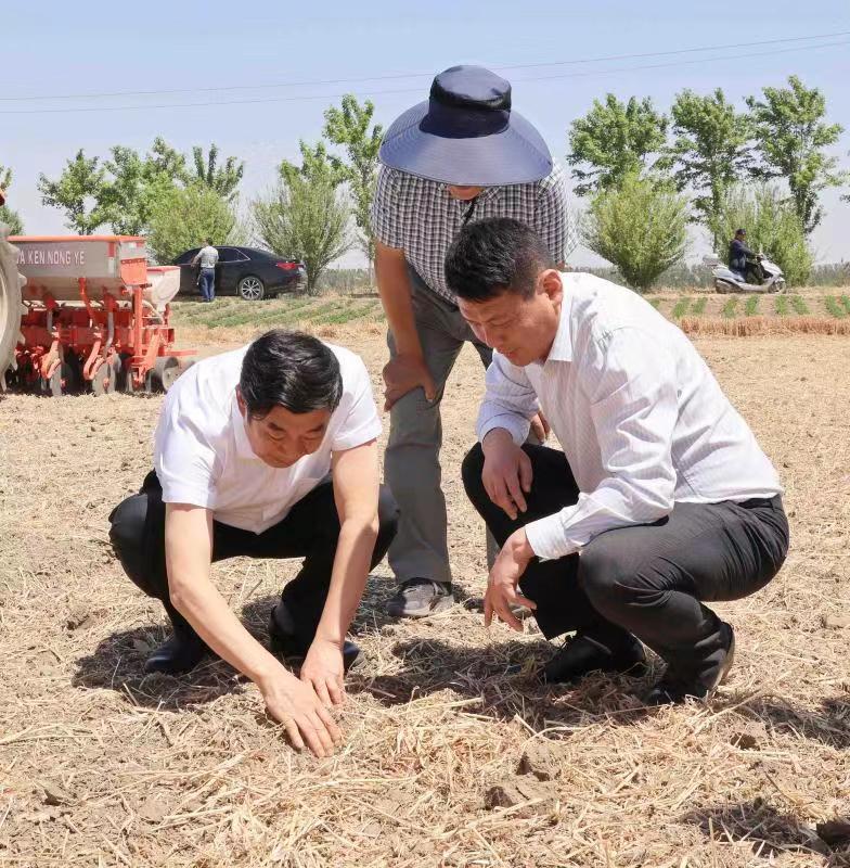 胡兆輝先后考察了蘇墾農(nóng)發(fā)股份公司崗埠分公司王溝生產(chǎn)區(qū)玉米大豆帶狀復合種植播種現(xiàn)場、耕地現(xiàn)場和崗埠生產(chǎn)區(qū)曬場糧食安全情況,并與檢查玉米大豆帶狀復合種植質(zhì)量的田間工作人員親切交談,對崗埠全場“一盤棋”、全力戰(zhàn)“三夏”給予充分肯定。胡兆輝指出,要提高政治站位,堅決服從國家戰(zhàn)略需要,高質(zhì)量完成省委省政府交予的重要任務(wù)。要增強全局意識,堅定信心,服從指揮,把思想認識行動統(tǒng)一到集團公司決策部署上來,以“國之大者”的胸懷壓實責任擔當。要堅定不移推進全面從嚴治黨,推動黨建工作與產(chǎn)業(yè)融合發(fā)展,以高質(zhì)量黨建引領(lǐng)高質(zhì)量發(fā)展。胡兆輝強調(diào),要通過推進玉米大豆帶狀復合種植推動產(chǎn)業(yè)結(jié)構(gòu)優(yōu)化升級,及時調(diào)整產(chǎn)業(yè)結(jié)構(gòu)和產(chǎn)品布局,加大機械投入,大力發(fā)展現(xiàn)代農(nóng)業(yè),力爭實現(xiàn)跨越式發(fā)展。要落實“藏糧于地、藏糧于技”以及藏糧于管戰(zhàn)略,嚴格執(zhí)行技術(shù)規(guī)程和試驗示范工作方案,及時總結(jié)經(jīng)驗,確保玉米大豆帶狀復合種植任務(wù)按時完成,堅決打贏玉米大豆帶狀復合種植播種這場硬仗。胡兆輝要求,要深刻理解做好“三夏”工作的重大意義,充分認清“三夏”工作的復雜性、艱巨性、特殊性,攻堅克難,主動擔當作為,全面抓好信訪穩(wěn)定、疫情防控、安全生產(chǎn)等工作,圍繞“五保一控”目標,誓奪“三夏”工作全面勝利,為江蘇農(nóng)墾高質(zhì)量完成10萬畝玉米大豆帶狀復合種植貢獻崗埠力量。
