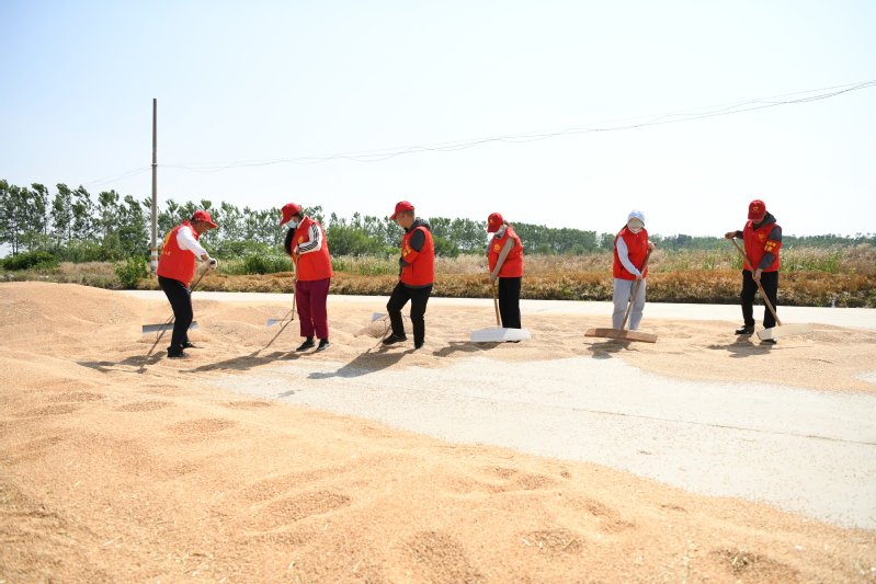 沖鋒在前,做好“助收員”。聞令而動(dòng)、依令而行,社區(qū)黨組織組織黨員干部深入三夏工作一線,幫助生產(chǎn)區(qū)搶收晾曬,曬場上,大家頂著烈日,及時(shí)翻、晾登場小麥。