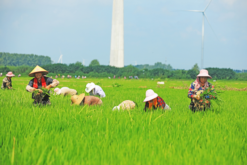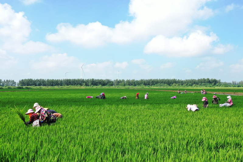 蘇墾農(nóng)發(fā)寶應(yīng)湖分公司擁有3500畝有機(jī)稻生產(chǎn)基地,該基地于2021年取得歐盟、國(guó)環(huán)雙認(rèn)證。為保障有機(jī)稻質(zhì)量,每到夏季,公司都會(huì)組織進(jìn)行人工拔“雜草稻”。高溫炙烤下,200多名勞動(dòng)者揮汗如雨,為生產(chǎn)出“魚(yú)米之鄉(xiāng)”高質(zhì)量有機(jī)米貢獻(xiàn)力量。
