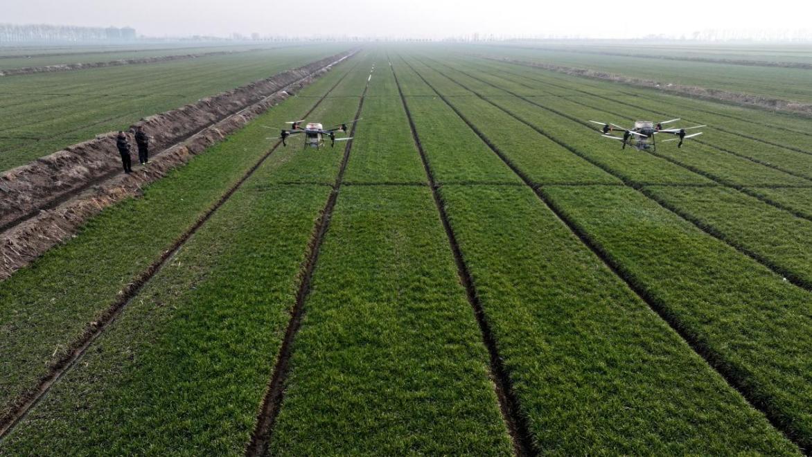 大年初一,廣袤的麥田春潮涌動,黃海田間地頭到處都是忙碌的身影。放眼望去,有忙著撒肥的,有忙著噴藥的,還有忙著運送物資的……伴隨著無人機螺旋槳的陣陣轟鳴聲,黃海大地充滿歡騰的氣息。黃海農(nóng)業(yè)技術人員深入田間,調查苗情長勢、病蟲草害,指導大隊因地制宜開展春季田間精細化管理工作。黃海近70臺植保無人飛機已整裝待發(fā),陸續(xù)開展科學施肥和植保防治工作,為奪取糧食豐產(chǎn)豐收奠定基礎。