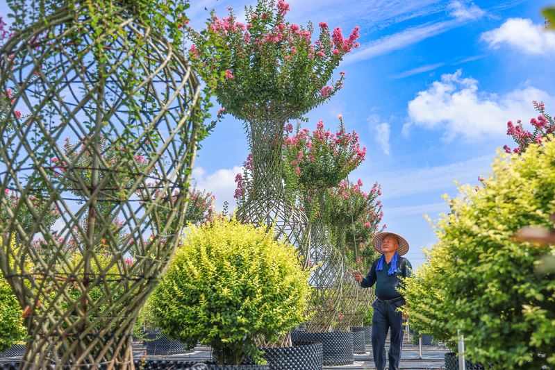 8月14日,在江蘇省鹽城市射陽縣,江蘇農(nóng)墾新洋農(nóng)場容器苗項目基地,管理人員正在養(yǎng)護(hù)紫薇花瓶。近年來,新洋農(nóng)場利用容器苗基地優(yōu)勢,在栽培方式上大膽嘗試,通過扦插培育,實現(xiàn)了自繁自育栽培技術(shù)的新突破,容器栽培的模式使苗圃成活率更高、綠化效果更好,優(yōu)良的品質(zhì)廣受全國各地綠化項目方的青睞。