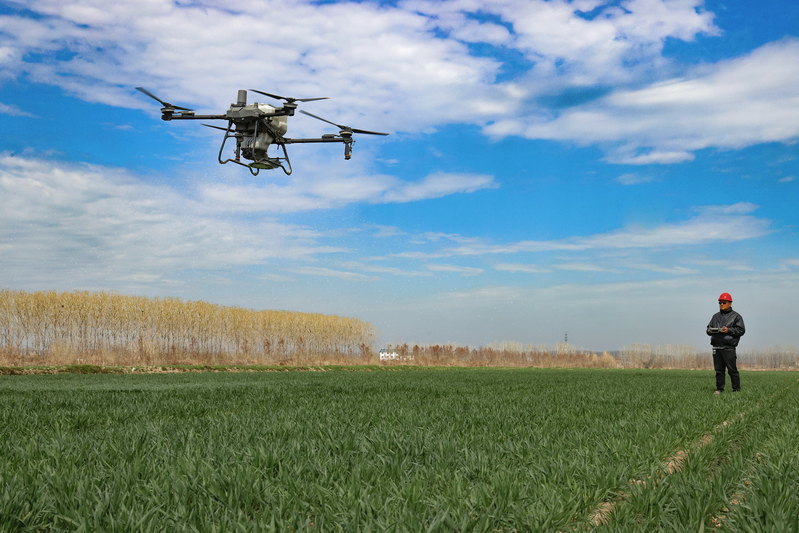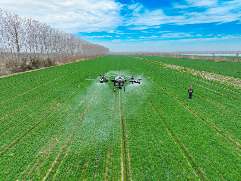 3月13日,江蘇省鹽城市射陽縣,在江蘇農(nóng)墾新洋農(nóng)場的一處高標準農(nóng)田里,農(nóng)技人員正在操縱一臺新式植保無人機,為小麥開展春季施肥作業(yè)。當前,新洋農(nóng)場6萬畝高標準農(nóng)業(yè)生產(chǎn)基地進入春管關(guān)鍵階段,該農(nóng)場搶抓農(nóng)時,積極開展春季田管作業(yè),助力夏糧穩(wěn)產(chǎn)增收。