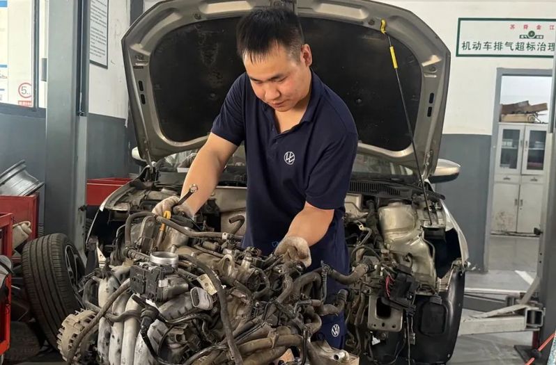 蘇舜金江公司(上汽大眾4S店)機電技師錢平崗正拆解一輛帕薩特車的發(fā)動機,他說:“客戶著急用車,這個假期就不休息了,要盡快把車修好?!?br />