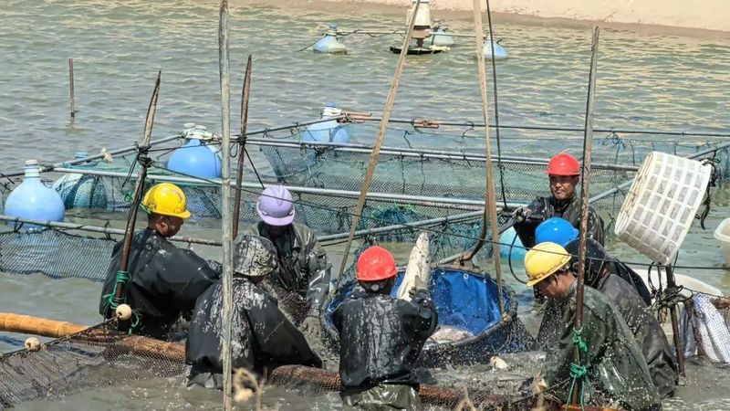 在塘口銷(xiāo)售現(xiàn)場(chǎng),工作人員分工協(xié)作,有條不紊地對(duì)捕撈出塘的成魚(yú)進(jìn)行挑選、稱重、裝車(chē),銷(xiāo)售人員在現(xiàn)場(chǎng)一絲不茍、認(rèn)真記磅。這些鮮活魚(yú)經(jīng)過(guò)養(yǎng)成、起捕到上市銷(xiāo)售的全過(guò)程質(zhì)量管控,將被發(fā)往全國(guó)各地,端上老百姓的餐桌。