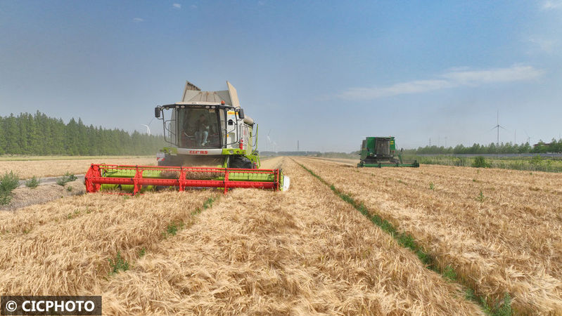 2025年5月20日,聯(lián)合收割機(jī)在位于江蘇省鹽城市射陽(yáng)縣的江蘇農(nóng)墾新洋農(nóng)場(chǎng)大麥田里作業(yè)。CICPHOTO/張偉生 攝