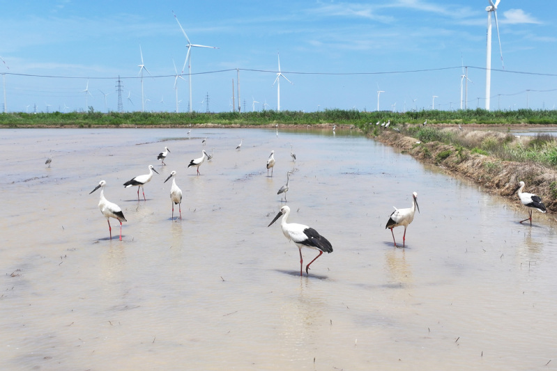 6月23日,江蘇省鹽城市射陽縣臨海農(nóng)場(chǎng)順泰生產(chǎn)區(qū)的水田里,50余只國家一級(jí)保護(hù)動(dòng)物東方白鸛姿態(tài)優(yōu)雅,正悠然漫步、覓食,與水田的碧波相互映襯,構(gòu)成一幅靈動(dòng)的生態(tài)畫卷。