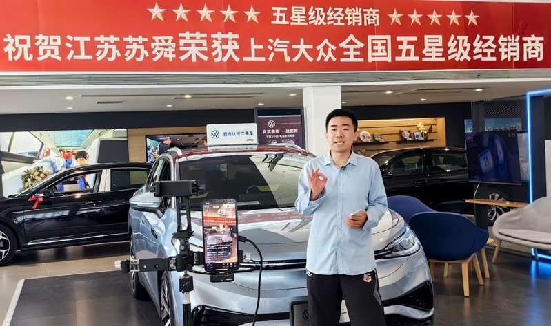 蘇舜公司創(chuàng)新“直播+服務(wù)”銷售模式,重點(diǎn)發(fā)力“抖音、小紅書”等平臺,加大直播場次與粉絲互動,將留資轉(zhuǎn)化率提升至12%,平均觀看時(shí)長達(dá)到23分鐘。圖為工作人員在直播間提供二手車在線置換評估、金融方案計(jì)算等服務(wù)。