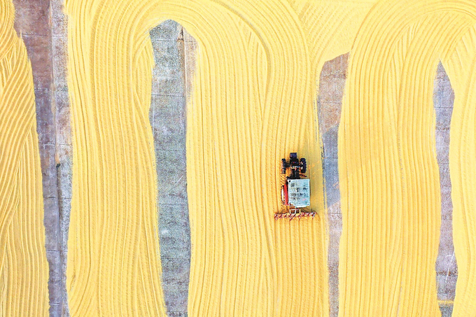 10月27日,連云港市海州區(qū)的江蘇農(nóng)墾崗埠農(nóng)場(chǎng),職工駕駛糧食翻曬機(jī)械在場(chǎng)上來(lái)回穿梭,翻曬剛剛收獲的水稻。 陶桂軍 嚴(yán)連鳳 攝(視覺江蘇網(wǎng)供圖)