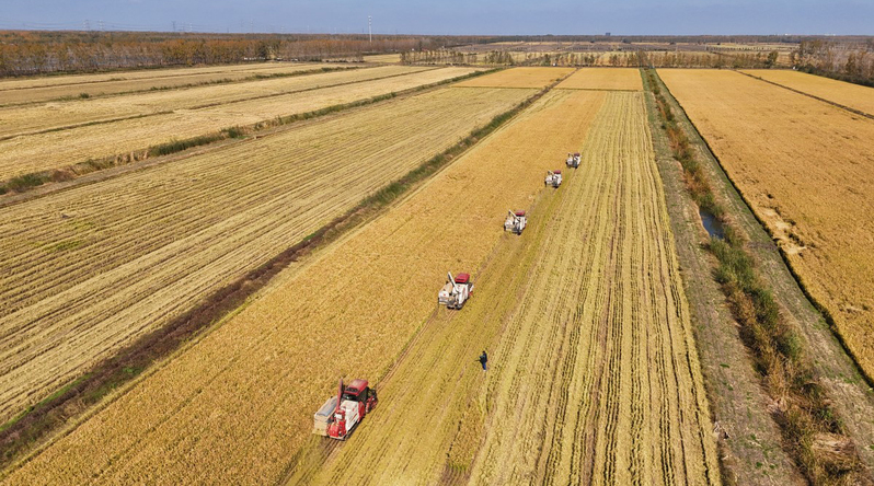 11月5日,連云港市海州區(qū),江蘇農(nóng)墾崗埠農(nóng)場的高標(biāo)準(zhǔn)農(nóng)田里,職工駕駛收割機(jī)來回穿梭,開展水稻搶收工作。連日來,當(dāng)?shù)胤e極組織人員、機(jī)械,搶抓農(nóng)時做好水稻收割工作,爭取盡快完成秋收,確保顆粒歸倉。徐衛(wèi) 方冉冉 攝