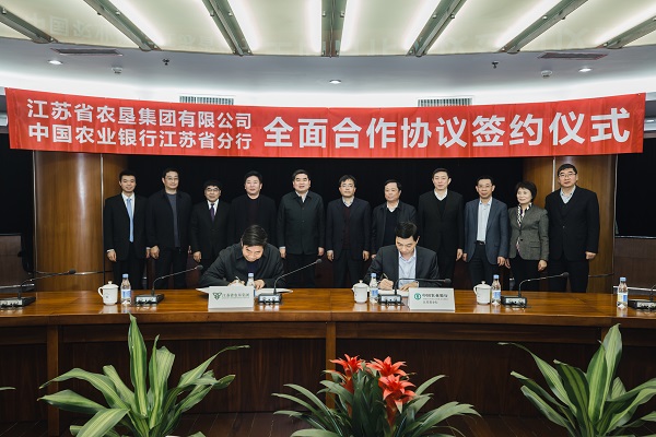 1月9日上午,集團公司與中國農(nóng)業(yè)銀行江蘇省分行簽署全面合作協(xié)議。集團公司黨委書記、董事長魏紅軍、總經(jīng)理胡兆輝、黨委委員、蘇墾農(nóng)發(fā)公司總裁蘇志富,江蘇農(nóng)行黨委書記、行長張建良、副行長周吉、程國新出席簽約