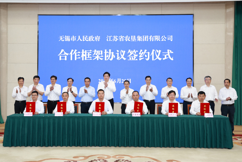 6月20日,集團(tuán)公司與無錫市政府簽署合作框架協(xié)議。無錫市委副書記、市長趙建軍會(huì)見集團(tuán)公司黨委書記、董事長吳本輝一行,并共同見證合作簽約。無錫市副市長馬良,市政府秘書長陳壽彬,集團(tuán)公司黨委委員、副總經(jīng)理王立新參加活動(dòng)。趙建軍對(duì)省農(nóng)墾集團(tuán)長期以來給予無錫發(fā)展的關(guān)心支持表示感謝。他說,當(dāng)前無錫正深入學(xué)習(xí)貫徹習(xí)近平總書記對(duì)江蘇工作重要講話重要指示精神,認(rèn)真貫徹落實(shí)習(xí)近平總書記關(guān)于“三農(nóng)”工作的重要論述,大力實(shí)施鄉(xiāng)村振興戰(zhàn)略,全面推進(jìn)耕地保護(hù)“三提兩嚴(yán)”行動(dòng),加快農(nóng)業(yè)現(xiàn)代化建設(shè)步伐。希望雙方以此次簽約為契機(jī),充分發(fā)揮省農(nóng)墾集團(tuán)在發(fā)展現(xiàn)代農(nóng)業(yè)方面所具有的規(guī)模、資源、技術(shù)、裝備和管理優(yōu)勢,圍繞土地流轉(zhuǎn)、規(guī)模種植和一體化全農(nóng)服務(wù)等領(lǐng)域加強(qiáng)產(chǎn)學(xué)研合作,攜手培育農(nóng)業(yè)新質(zhì)生產(chǎn)力,努力為保障國家糧食安全、推進(jìn)鄉(xiāng)村全面振興貢獻(xiàn)更大力量。同時(shí),期待雙方不斷拓展在醫(yī)藥健康、生態(tài)環(huán)保、房地產(chǎn)等方面的合作空間,在更寬領(lǐng)域、更深層次實(shí)現(xiàn)互利共贏。吳本輝在簡要介紹集團(tuán)生產(chǎn)經(jīng)營情況后表示,無錫農(nóng)業(yè)強(qiáng)、農(nóng)村美、農(nóng)民富,“魚米之鄉(xiāng)”底蘊(yùn)深厚、盛名遠(yuǎn)揚(yáng)。他說,近年來省農(nóng)墾集團(tuán)深入學(xué)習(xí)貫徹習(xí)近平總書記關(guān)于農(nóng)墾工作重要論述,認(rèn)真落實(shí)省