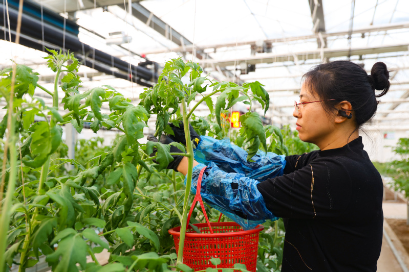 時值12月,云臺大地寒意漸濃,興墾科技植物工廠在陽光的艷照下格外耀眼,“產(chǎn)自興墾植物工廠的小番茄,歷年來個頭顏色相似、品感穩(wěn)定,秘密都在這個充滿科技范的溫室里?!闭诿β档闹参锕S“管家”淤秀林笑意連連。打開植物工廠兩層大門,清新濕潤的氣息撲面而來,栽培架成排林立,一排排整齊的番茄植株正茁壯成長,翠綠的枝葉在燈光與陽光交織下閃爍,技術(shù)人員手持工作筆記穿梭其間統(tǒng)計數(shù)據(jù),工人站在智能化升降工作車上沿軌道對番茄藤進行盤頭、繞蔓,2200平方米空間、10余個小番茄品種的生長透出濃濃的科技范。技術(shù)員於秀林說“植物工廠番茄并非扎根于傳統(tǒng)土壤,而是‘住’在椰糠之中。椰糠是用椰子外殼纖維加工而成的基質(zhì),具有良好的透氣性、保水性和排水性,為番茄根系提供了一個絕佳的生長環(huán)境。它既能夠穩(wěn)固植株,又能讓根系自由地呼吸和吸收養(yǎng)分,是番茄舒適的“綠色床鋪”。不僅如此,小番茄還享受著水肥一體的滴灌系統(tǒng)的施肥終端。每株番茄配備一根滴箭,里面是技術(shù)人員根據(jù)選擇品種生長習(xí)性調(diào)配出的水肥營養(yǎng)液,電腦端設(shè)置好用量和次數(shù),每隔一段時間,自動精準滴灌施肥?!闭f話間,技術(shù)員拔出一支滴箭,仔細檢查根部濕度,他現(xiàn)在將終端設(shè)置聯(lián)網(wǎng)在了自
